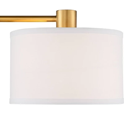 - Warm antique gold finish. Metal construction. White linen uno-fitter drum shade.