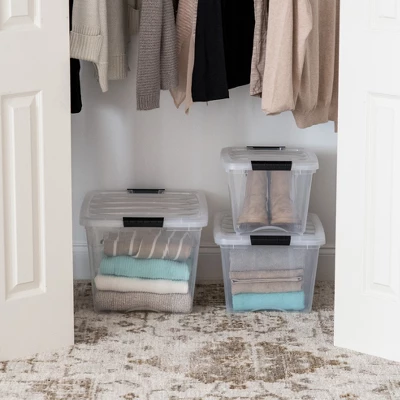The stackable storage bin system built to meet your needs. These IRIS USA Stack & Pull™ storage boxes easily stores clothes, linens, shoes, and more. Sturdy buckle up latches keep the lid securely in place, and the built-in handle makes it easy to pull the box off of a shelf. Storing boxes stack neatly with other units in the Stack & Pull™ series. Set includes one 53 QT, one 32 QT, and one 19 QT Stack & Pull™.