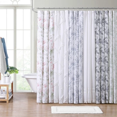 - Add a touch of style and dimension to your bathroom with the Laura Ashley Adelina Shower Curtain. The shower curtain features a white on white dimensional lattice made of appliqued ruffles. This gorgeous shower curtain creates a pristine design statement on its own or can be a versatile base for layering and creating your own personal bathroom look.