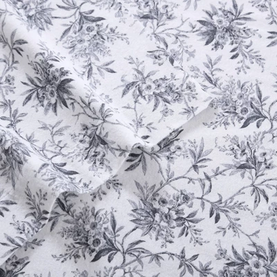 - The Faye Toile flannel sheet has a black floral print on white ground