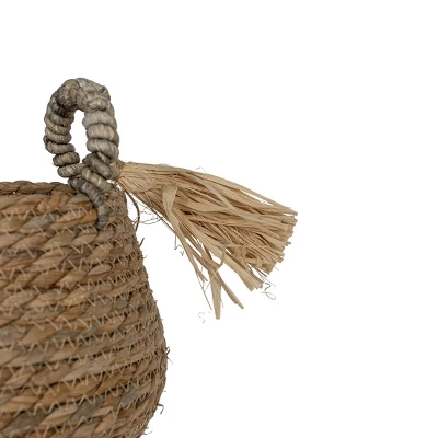 A beautiful hand-woven basket crafted from natural seagrass fibers, finished with corn husk wrapped handles and a raffia tassel. This basket offers a great option for stylish organization as well as being a great decorative accent. Add a small potted plant for a touch of greenery to your boho aesthetic.