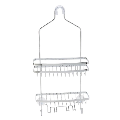 Keep your shower organized with the Bath Bliss shower caddy. Mounts easily over your shower head and with 2 suction cups this caddy stays stable keeping all of your items sturdy. Features 1 deep and 1 shallow basket for multiple storage options. Complete with 2 hanging hooks for towels and 4 built in hooks for razors and toothbrushes. The rust resistant iron construction design allows this item to last!